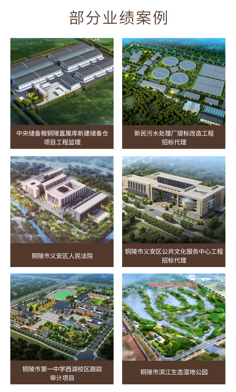 主要工程監(jiān)理項(xiàng)目如:黃山互助公社項(xiàng)目、黃山區(qū)瑞園一期工程、黃山區(qū)瑞園二期工程、南陵新天地商業(yè)廣場(chǎng)項(xiàng)目工程、南陵萃英園中學(xué)學(xué)生公寓及食堂建設(shè)工程、銅陵濱江生態(tài)岸線北延伸段(東側(cè))整治工程-景觀工程、銅陵市黑砂河下游截污工程、中央儲(chǔ)備糧銅陵直屬庫(kù)新建儲(chǔ)備倉(cāng)工程、銅港路綠化改造提升工程、恒順紫金城4-1地塊6#-10#樓工程、中房?微公館、市政設(shè)施管養(yǎng)所與城市綠化管理養(yǎng)護(hù)基地維修用房工程、民主小學(xué)教學(xué)樓及辦公樓工程、安徽泰新汽車項(xiàng)目年產(chǎn)10萬(wàn)輛份乘用車漆后車身總成項(xiàng)目、銅陵市城市雕塑維護(hù)和建設(shè)項(xiàng)目、銅陵市特殊學(xué)校教學(xué)樓及宿舍工程、銅陵新港塑膠制品有限公司廠房工程等、五松鎮(zhèn)荷花塘(含頂管)及月瀛玉帶小區(qū)整治工程、義安區(qū)鐘鳴硫鐵礦廢棄礦坑滲水治理項(xiàng)目、銅陵獅達(dá)防火門廠1#2#廠房及綜合樓工程、銅陵市濱江生態(tài)岸線北延伸工程(濱江大道東側(cè)景觀整治)、黑沙河水質(zhì)提升改造工程一標(biāo)段、義安區(qū)法院審判庭工程、市一中圖書閱覽室工程及樅陽(yáng)縣城區(qū)防洪安保應(yīng)急工程連城湖出口左右岸堤防加固工程(一標(biāo)段、二標(biāo)段)。
