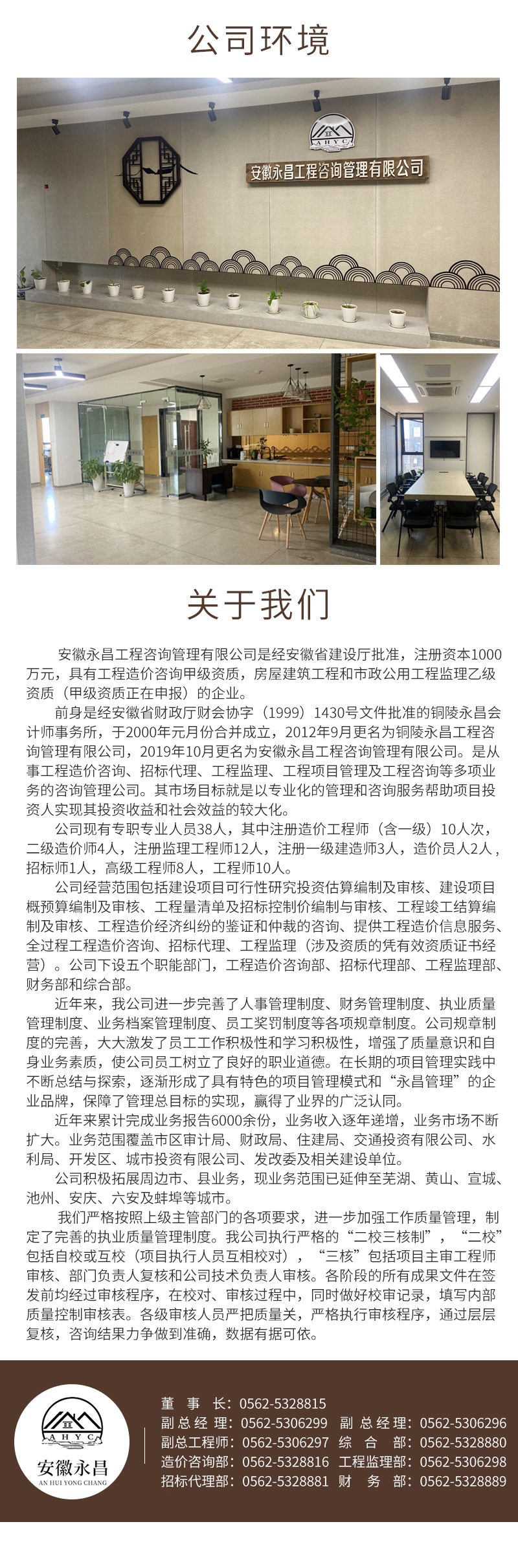 安徽永昌工程咨詢管理有限公司是經(jīng)安徽省建設(shè)廳批準(zhǔn),具有工程造價(jià)咨詢甲級(jí)資質(zhì),房屋建筑工程和市政公用工程監(jiān)理乙級(jí)資質(zhì)的企業(yè)。